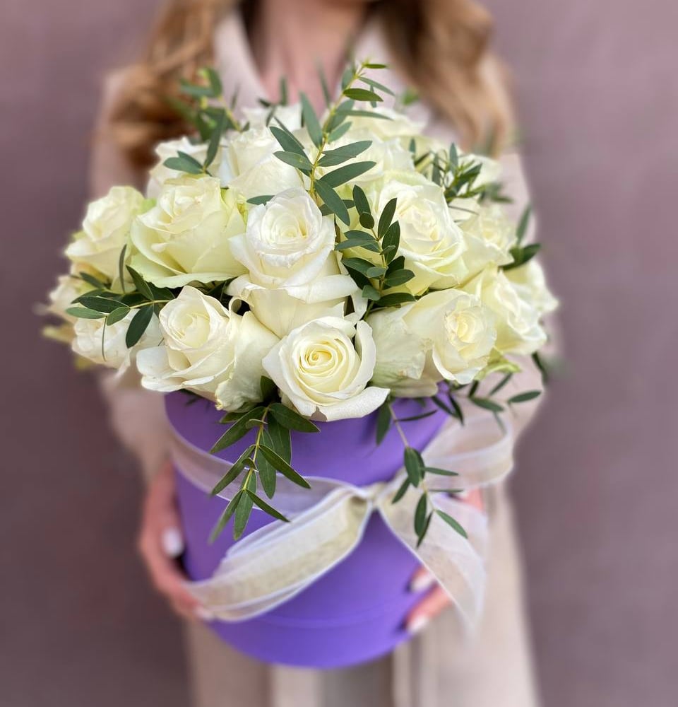 Blumenbox '31 weiße Rosen in einer Hutschachtel'