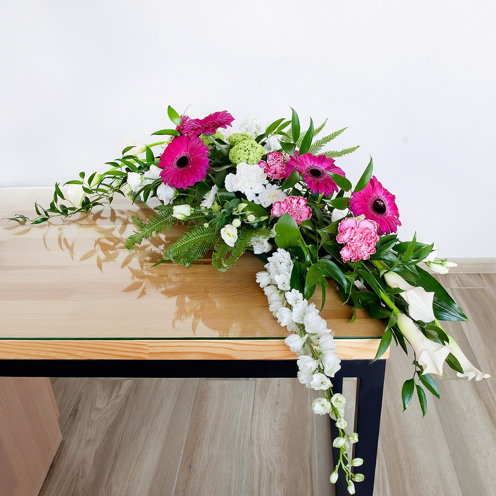Eine berührende Komposition aus frischen Gerberas, Calla-Lilien und Lisianthus wird Ihr aufrichtiges Beileid und Ihren Respekt gegenüber dem Verstorbenen zum Ausdruck bringen.