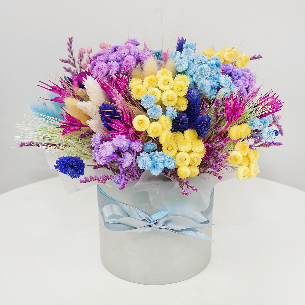 Dieser wunderschöne Blumenstrauß besteht aus einer Vielzahl von Trockenblumen, die in einem runden Blumenkasten mit den Abmessungen 20x16cm arrangiert sind. Der Blumenkasten ist in eine moderne Ver...