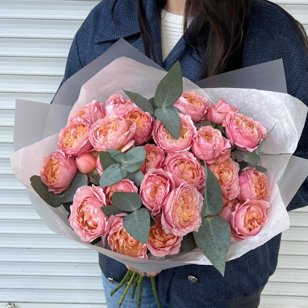 Blumenstrauß aus Pfingstrosen und Eukalyptus