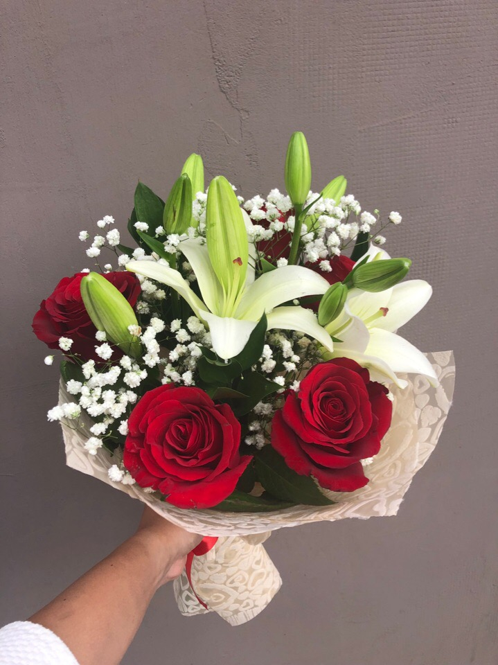 Blumenstrauß mit Lilie, Rosen und Schleierkraut