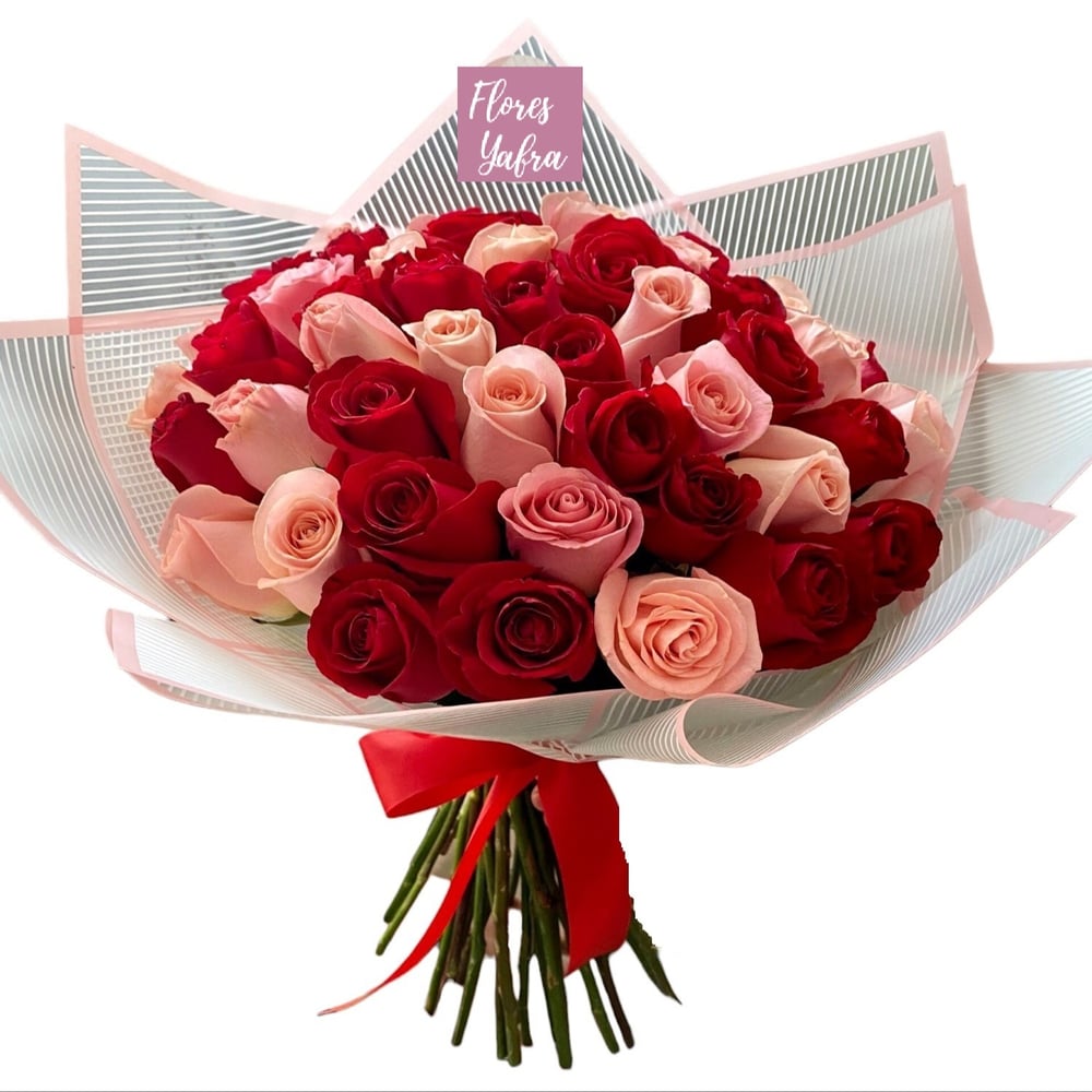 Strauß aus 50 Rosen in der Farbe oder den Farben Ihrer Wahl, dekoriert mit Papier, Laub, Schleife und Karte.