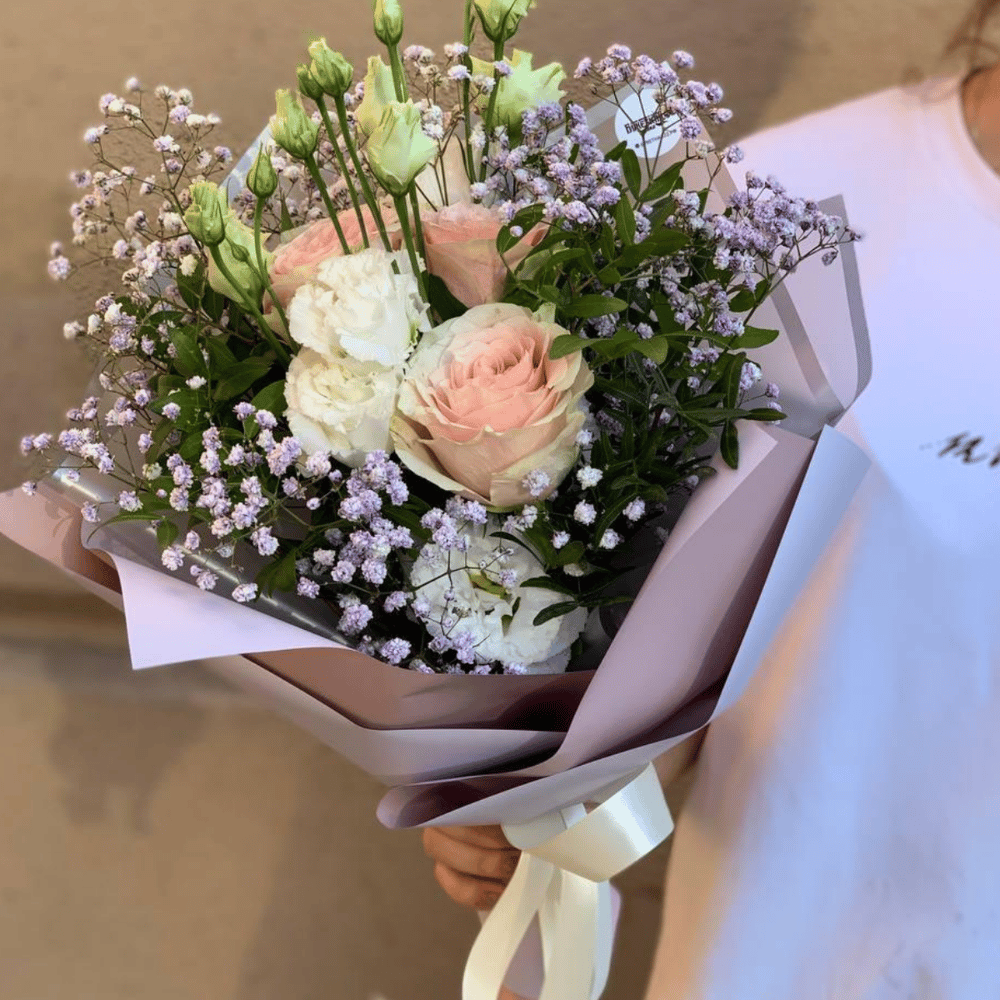 Blumenstrauß 'Bouquet of roses, eustoma and gypsophila'