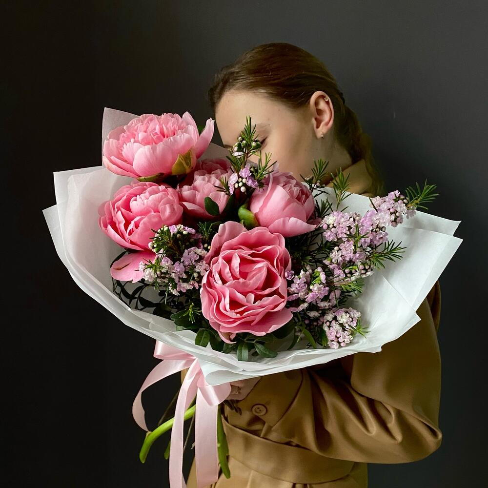 Blumenstrauß 'Bouquet with peonies and chamelacium'