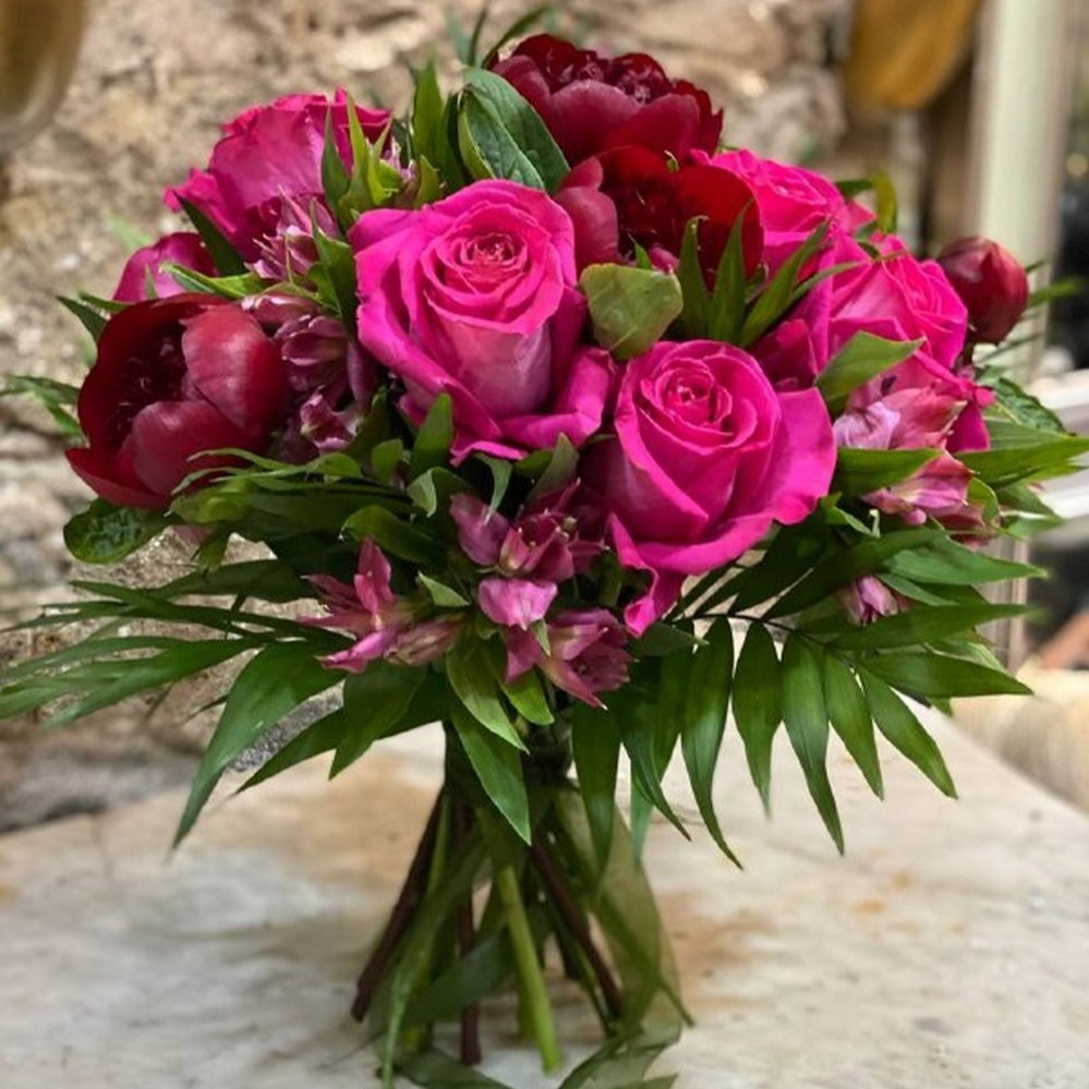 Ein saftiger Sommerstrauß aus Pfingstrosen, Rosen und Alstroemerien ist für jeden Anlass geeignet.