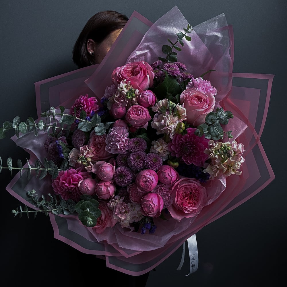 Ein atemberaubender Blumenstrauß mit Rosen, Sprayrosen, Limonium, Pfingstrosen-Sprayrosen und Lisianthus. Größe: Groß, Höhe 50 cm. Hinweis: Wir arbeiten mit frischen, saisonalen Blumen, daher kann die Zusammenstellung des Straußes leicht variieren. Selbst wenn eine bestimmte Saisonblume nicht verfügbar ist, bemühen wir uns, einen ähnlich aussehenden Blumenstrauß zu kreieren. Wenn eine bestimmte Blume für Sie besonders wichtig ist, kontaktieren Sie uns bitte mit Ihrer Notiz, und wir besprechen die Optionen.