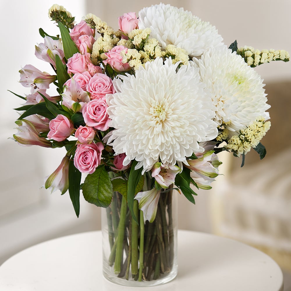"Engelsflügel" ist ein magischer Blumenstrauß, der Zartheit und Eleganz vereint. Er enthält einzelne Chrysanthemen, Strauchrosen, Alstroemerien und Statice. Diese Blumen symbolisieren Reinheit, Unschuld und göttliche Schönheit.