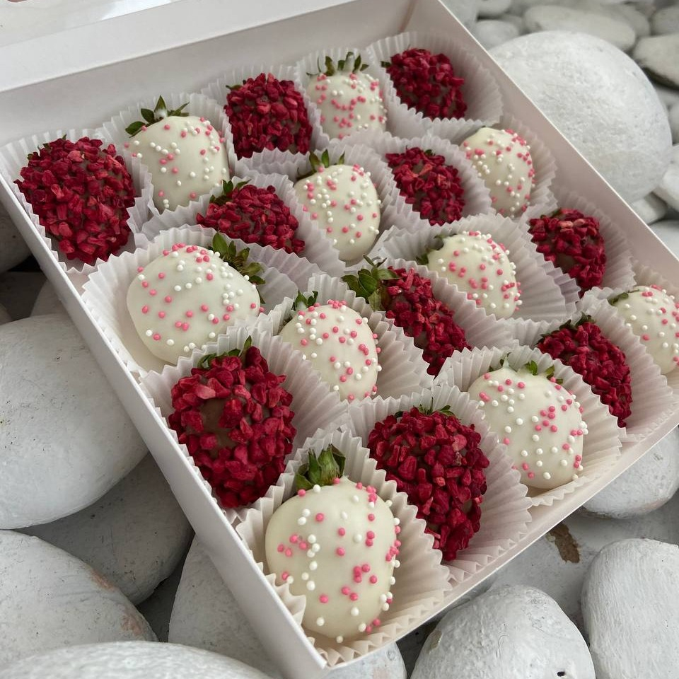 Erdbeeren in zarter Schokolade sind eine ausgezeichnete Wahl für diejenigen, die ein köstlicheres und harmonischeres romantisches Set geben möchten. Die Verpackung sieht sehr stylisch aus und die E...