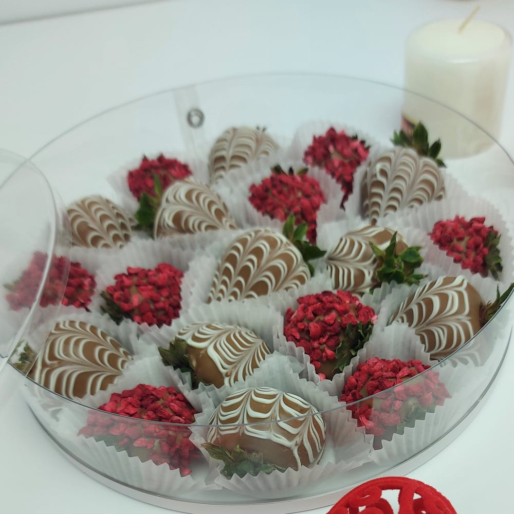 Erdbeeren in zarter Schokolade sind eine ausgezeichnete Wahl für diejenigen, die ein köstlicheres und harmonischeres romantisches Set geben möchten. Die Verpackung sieht sehr stylisch aus und die E...