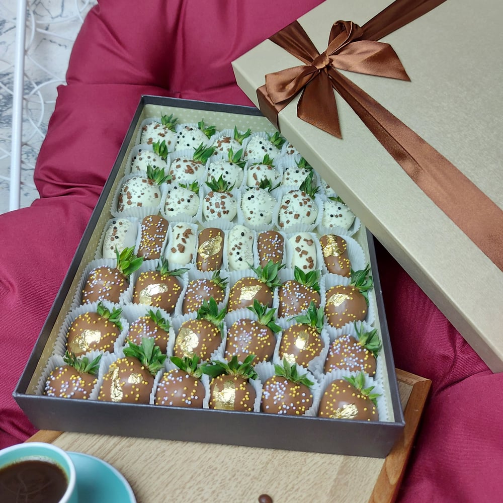 Erdbeeren in zarter Schokolade sind eine ausgezeichnete Wahl für diejenigen, die ein köstlicheres und harmonischeres romantisches Set geben möchten. Die Verpackung sieht sehr stylisch aus und die Erd…