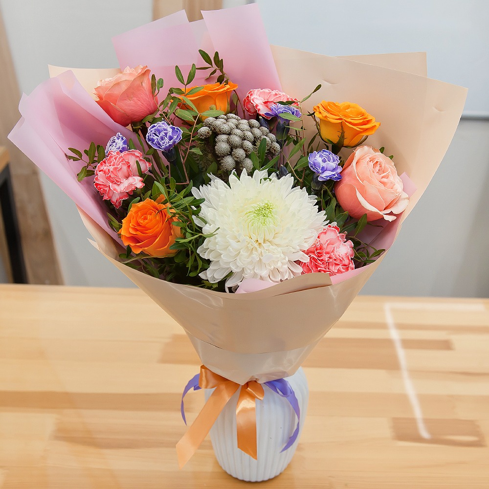 Dieser Strauß ist ein Fest der Farben und Texturen. Mit seiner Kombination aus Einsamer Gänseblümchen-Pompon, Nelke, Spraynelke, Rosa Rose, Pfingstrose Rose Kahala, Brunia Green Lanuginosa und Pist...
