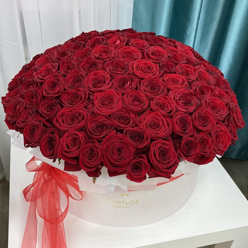 Luxuriöse Komposition aus 125 burgunderfarbenen Rosen in einer Box. Die Farbe der Box kann vom Muster abweichen.