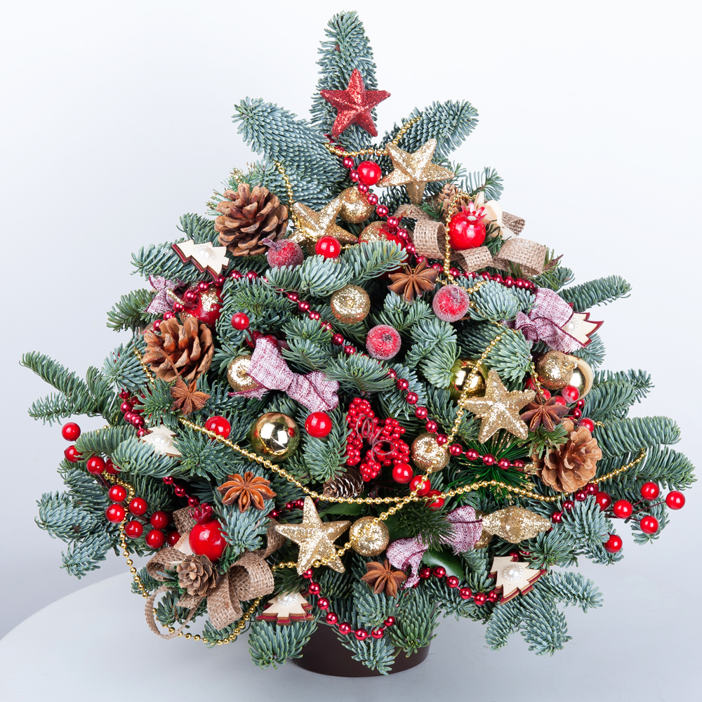 Dieser besondere Weihnachtsstrauß ist perfekt geeignet, um die festliche Stimmung in Deinem Zuhause zu verbreiten. Er besteht aus einer wunderschönen Edeltanne, die dem Strauß seine charakteristische Form verleiht. Die Tanne ist in einem stilvollen Pflanzgefäß aus Kunststoff arrangiert, das dem Strauß eine moderne Note verleiht. Um sicherzustellen, dass die Tanne immer frisch bleibt, ist sie in Steckschaum platziert, der das Wasser speichert und somit eine langanhaltende Frische gewährleistet. Dadurch können Sie noch länger Freude an dem Strauß haben. Eine kleine Weihnachtsdekoration verleiht dem Strauß eine festliche Note. Die traditionellen Weihnachtsfarben Rot und Grün werden durch das Verpackungsband betont, das den Strauß umwickelt. Es verleiht dem Strauß eine elegante und gleichzeitig verspielte Ausstrahlung. Dieser Weihnachtsstrauß ist ein wunderbarer Blickfang und eignet sich sowohl als Dekoration für den eigenen Wohnraum als auch als Geschenk für Deine Lieben. Er bringt die festliche Stimmung und die Vorfreude auf die Weihnachtszeit zum Ausdruck. Egal ob auf dem Esstisch, auf dem Kaminsims oder auf einer Kommode - dieser Strauß wird sicherlich alle Blicke auf sich ziehen.