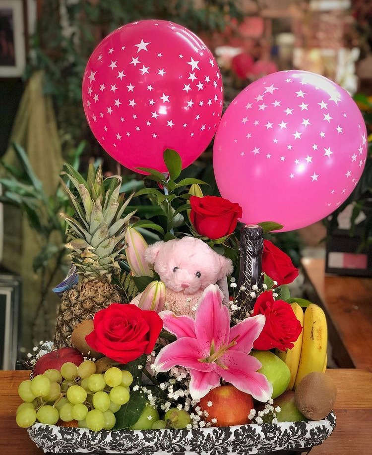 Die Komposition besteht aus saisonalen Früchten, einem Teddybär, Wein und zwei Ballons. Die Komposition ist mit Rosen und Lilien dekoriert.