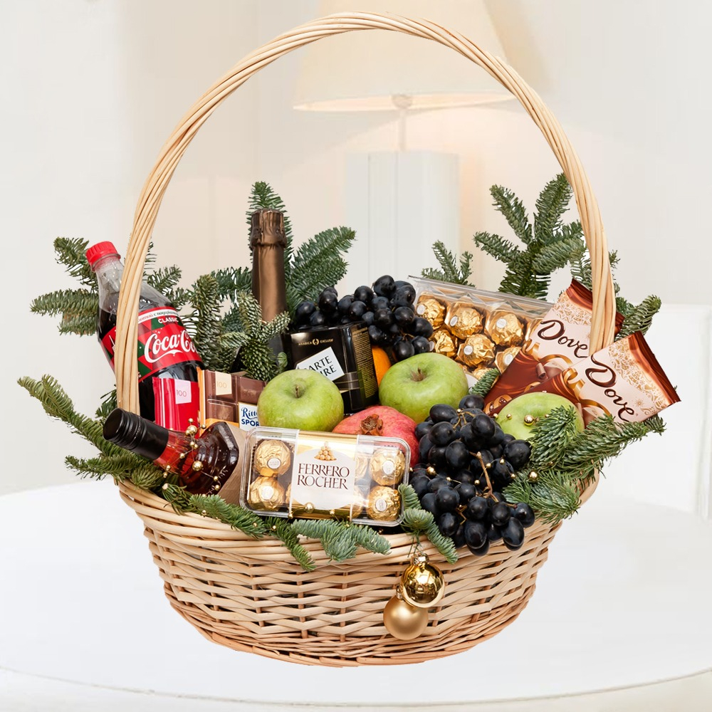 Der Blumenarrangement mit Edeltanne ist ein festlicher und vielseitiger Blumenstrauß, der perfekt für die Weihnachtszeit geeignet ist. Er enthält eine Vielzahl von Elementen, um das Fest noch schöner zu machen. Der Blumenarrangement wird in einer Verpackungsfolie geliefert, die den Blumen Schutz bietet und sie frisch hält. Zusätzlich wird der Strauß mit einem eleganten Verpackungsband zusammengebunden, das ihm einen edlen und professionellen Look verleiht. Der Blumenarrangement mit Edeltanne wird in einem großen Korb präsentiert, der nicht nur als Verpackung dient, sondern auch als stilvolles Dekorationselement verwendet werden kann. Als besondere Überraschung enthält der Blumenarrangement eine köstliche Schokolade Ritter Sport 100g, die den Geschmackssinn verwöhnt und das festliche Ambiente versüßt. Um den Weihnachtsgeist zu betonen, wird der Blumenarrangement mit einer charmanten Weihnachtsdekoration geschmückt, darunter eine funkelnde Weihnachtskugel, die dem Strauß einen festlichen Touch verleiht. Für eine zusätzliche frische Note enthält der Blumenarrangement einen Apfel, der nicht nur farbenfroh und dekorativ aussieht, sondern auch einen angenehmen Duft verbreitet. Um den festlichen Charme zu verstärken, enthält der Blumenarrangement eine Flasche Coca-Cola und Champagner als Geschenk, die zusammen mit den Blumen perfekt zu jeder Weihnachtsfeier passen. Um den geschmacklichen Genuss zu erweitern, enthält der Blumenarrangement auch einen köstlichen Granat, eine Flasche Whisky 0,5 Liter, eine Orange und eine Weintraube, die Geschmacksknospen im Festmodus halten. Um den Blumenarrangement mit köstlichen Leckereien aufzuwerten, werden zudem Instantkaffee und Pralinen Ferrero Rocher (300g) hinzugefügt. Der Blumenarrangement mit Edeltanne ist eine perfekte Mischung aus Schönheit, Frische und festlichem Genuss. Dieser Blumenarrangement wird sicherlich das Highlight jeder Weihnachtsfeier sein und den Empfänger begeistern.
