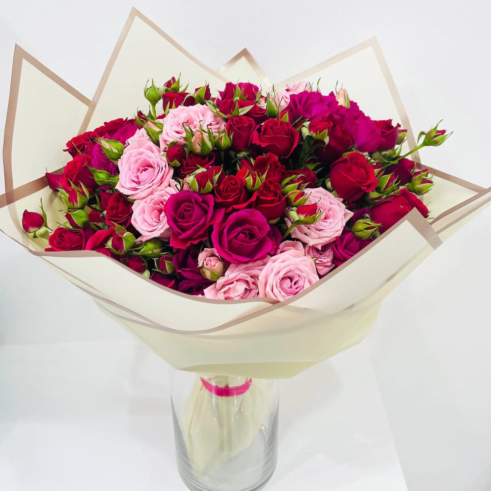 Wunderschön verpackter Blumenstrauß mit 10 Stielen Rosen in Fuchsienpink, 8 Stielen Rosen in zartem Rosa, 20 Stiele roten Rosen und 12 Stielen roten Sprayrosen.