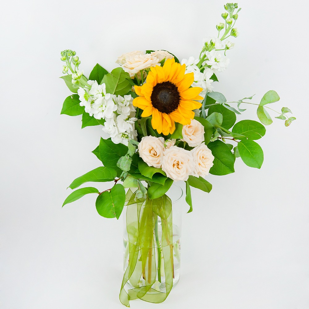 Schön und geheimnisvoll, dieser Strauß aus Sonnenblumen, cremefarbenen Sprayrosen und duftender Levkojen in mitternachtsblauem mattem Papier ist das perfekte Geschenk für jede Feier!