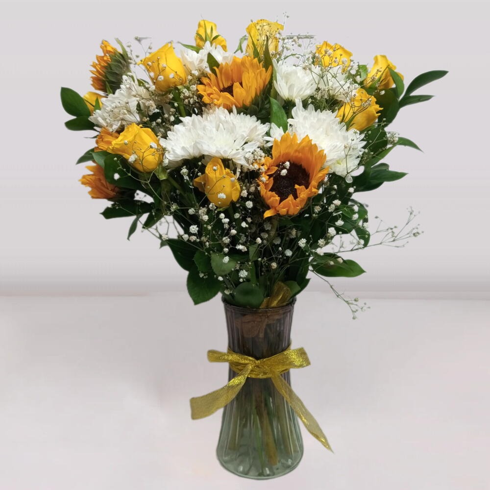 Sonnenblume - 5 Stk Vase - 1 Stk Baby Breath - 2 Stk weiße Chrysantheme - 4 Stk Ruscus - 4 Stk gelbe Rosen - 10 Stk