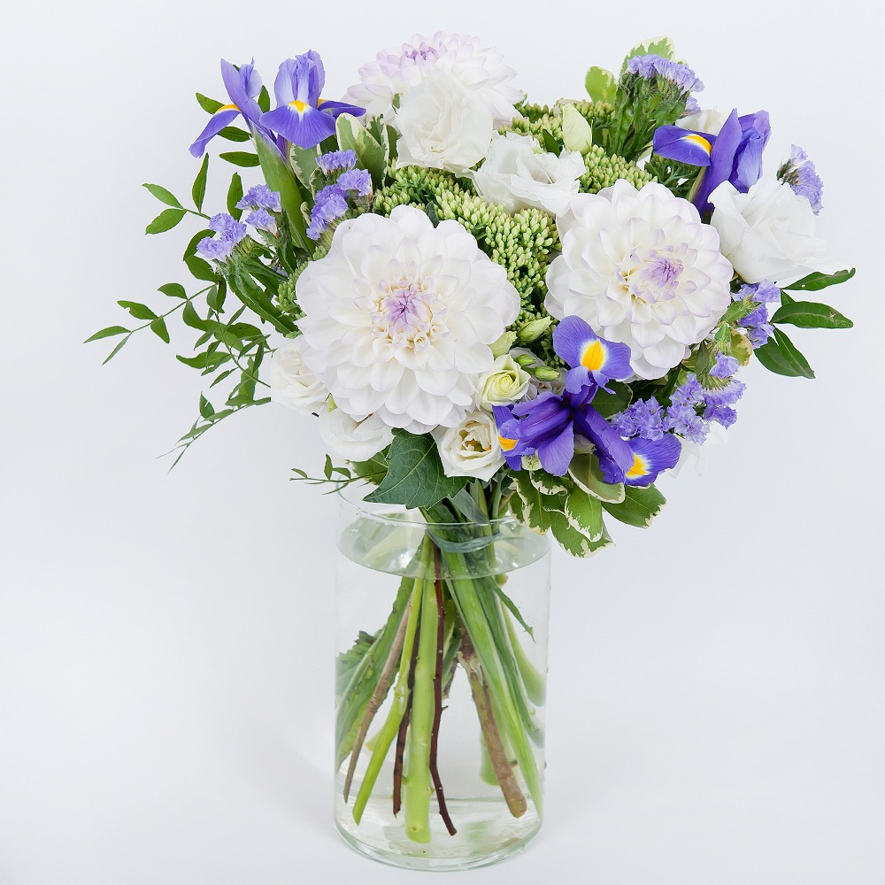 Dieser bezaubernde Blumenstrauß ist eine perfekte Kombination aus Schönheit und Eleganz. Er besteht aus Dahlien, Lisianthus (auch bekannt als Eustoma), Schwertlilien, Strandflieder, Pistazienblatt,...