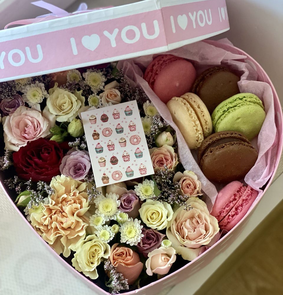 Herzbox mit Blumen und Kuchen