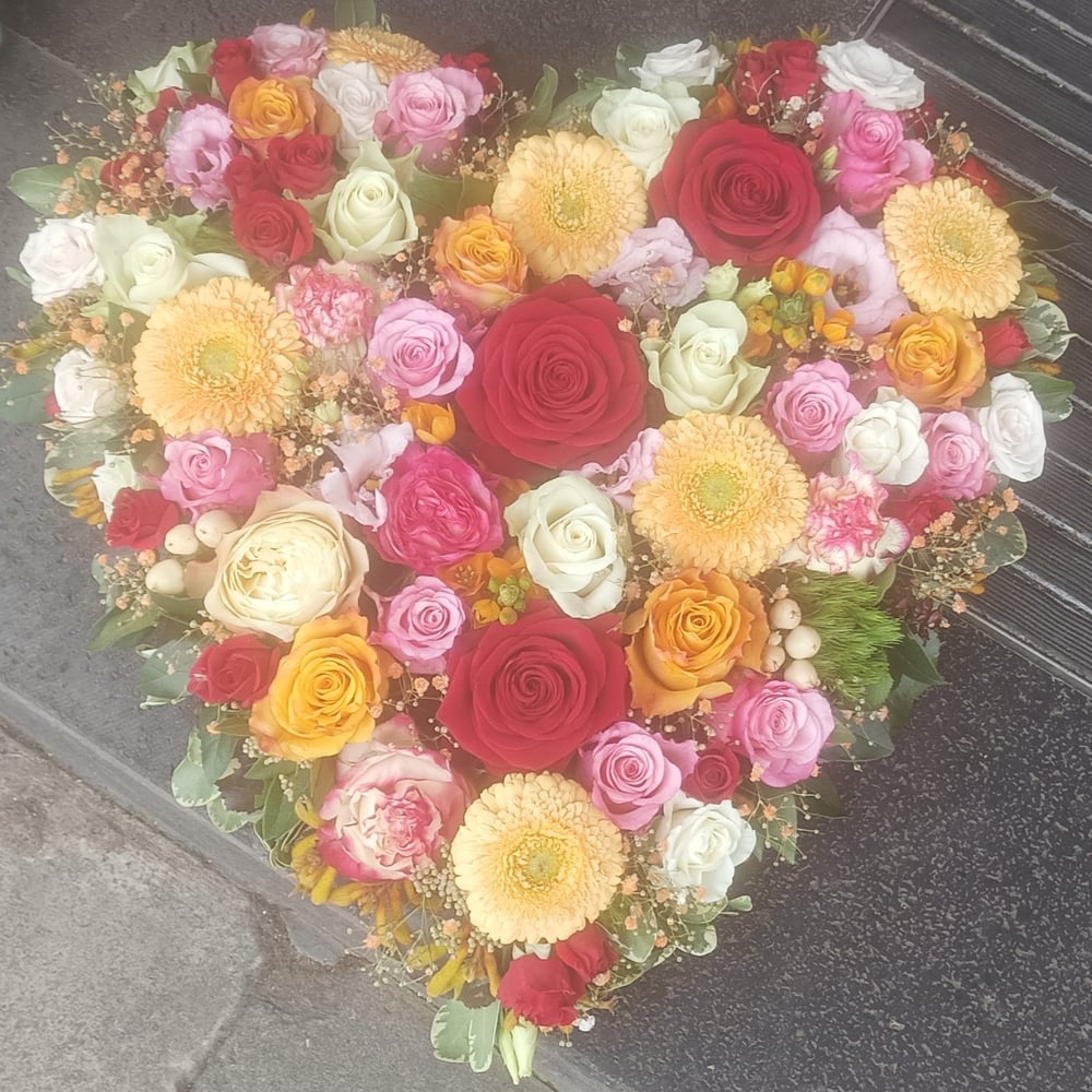 Ein herzförmiges Arrangement, überwiegend aus Rosen in unterschiedlichen Größen und Farben, ergänzt durch Grünzeug und farbige Akzente wie Schleierkraut, gemischt mit Eustoma und Nelken, in einer z...