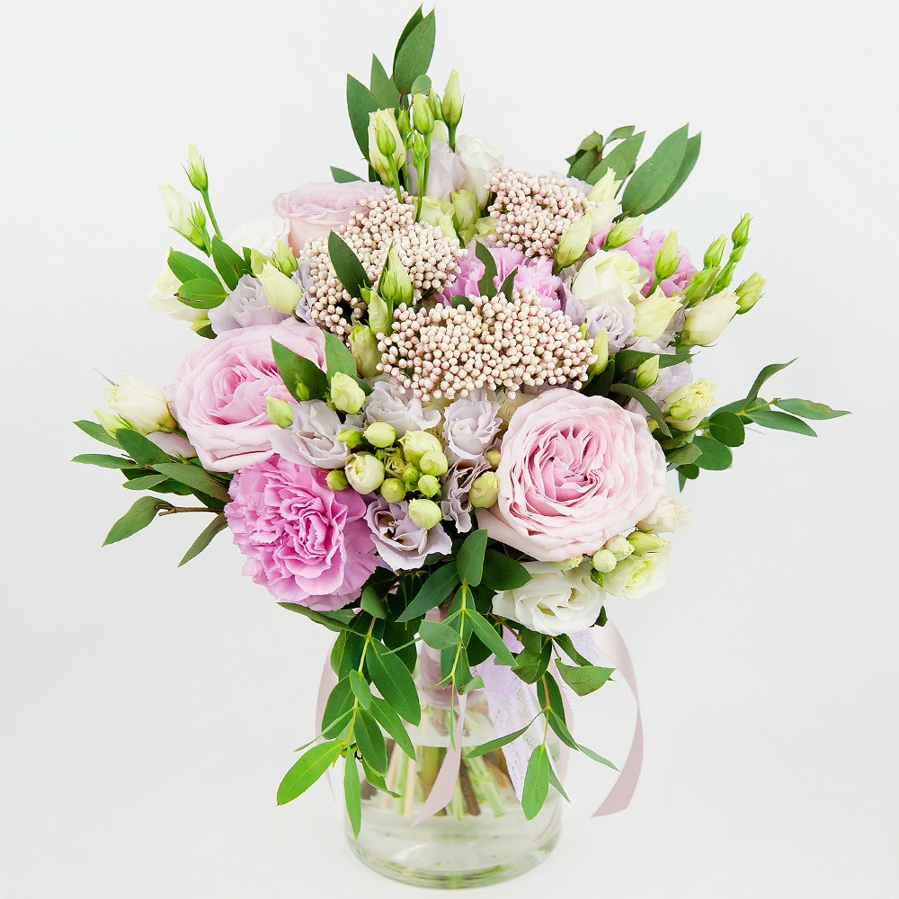 Zart und frisch wie die Jugend selbst, wird dieser prächtige Brautstrauß aus Pfingstrosen, Ozotamnus, Nelken, Lisianthus und Rosen zum Höhepunkt Ihres Hochzeitsbildes.