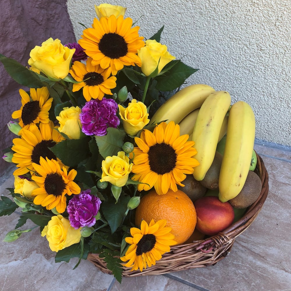 A fruit basket combined with sunflowers is a great gift option.