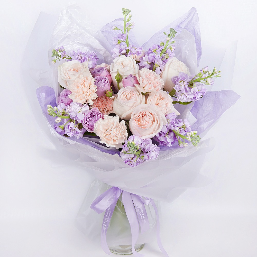 Der Strauß "Lavendelzärtlichkeit" ist die Verkörperung von Zärtlichkeit und Romantik. Er kombiniert pfingstrosenähnliche Strauchrosen, Nelken und Levkojen, was einen einzigartigen lavendelfarbenen Ton schafft. Moderne Verpackung und die pfingstrosenähnliche Rose OHara machen diesen Strauß zum idealen Geschenk für jeden Anlass.