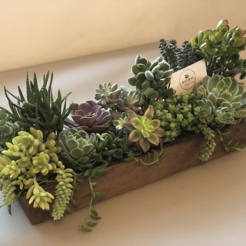 Holzkiste von 30 cm, die 12-15 Sorten kleiner und mittlerer Sukkulenten enthält, dekoriert und nach Höhe angeordnet. In die Holzkiste wird Floristenfolie eingelegt und die Sukkulenten werden umgepflanzt, um eine harmonische und ästhetisch schöne Komposition zu schaffen.