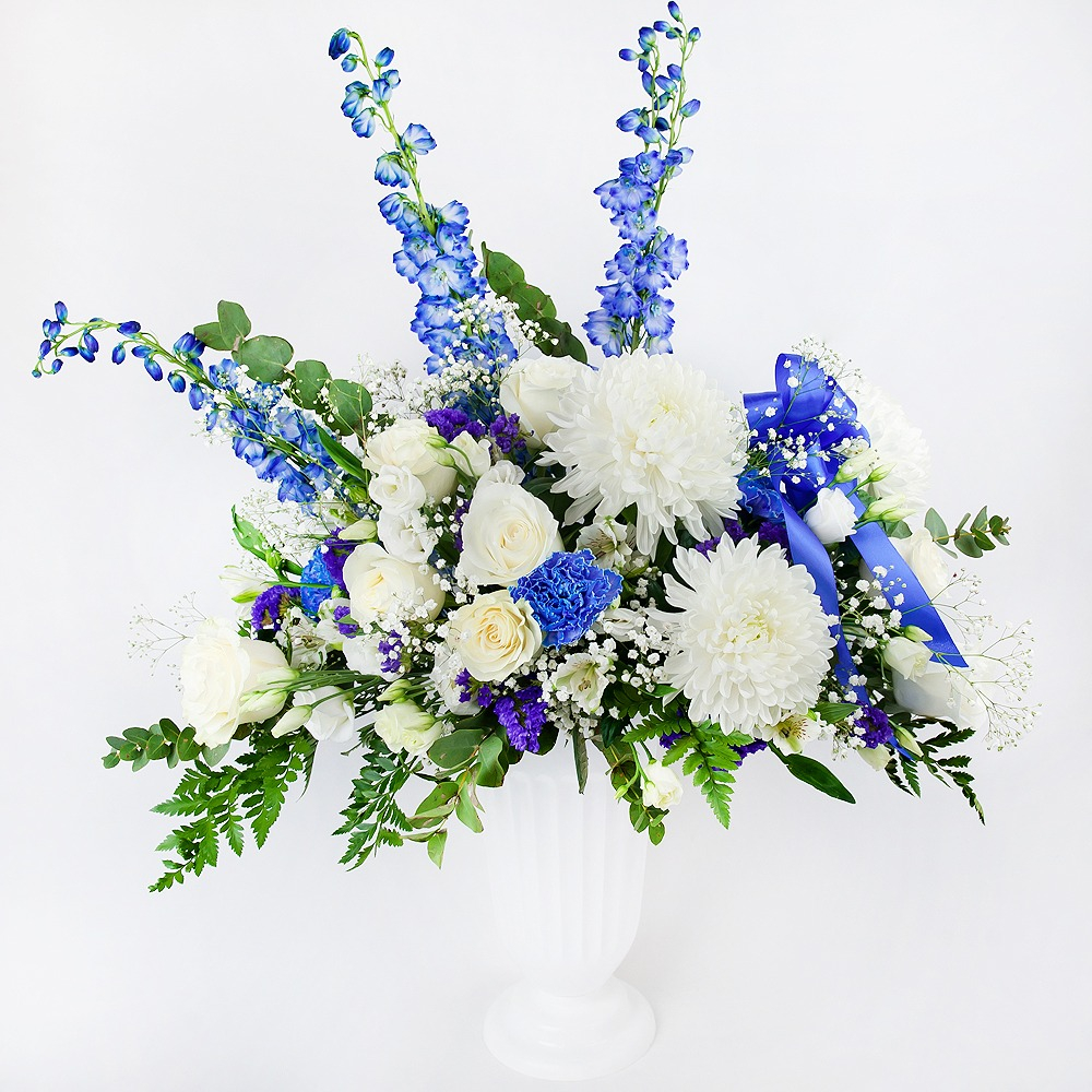 Viele Religionen glauben, dass die Seele nach dem Verlassen des Körpers wie ein freier Vogel in den Himmel aufsteigt, wo sie ewige Ruhe findet. Begeben Sie sich mit diesem prächtigen Strauß aus Rosen, Chrysanthemen und Rittersporn auf die letzte Reise.
