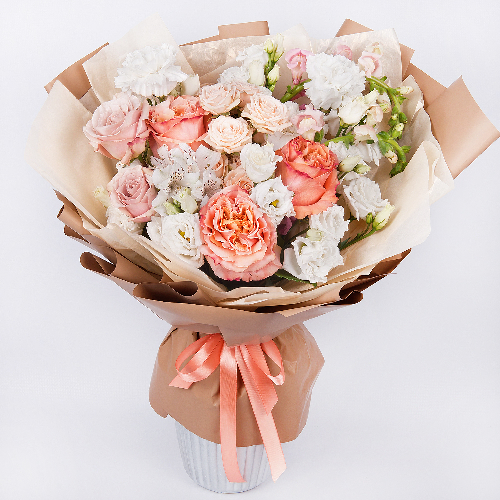 Der Strauß "Musik der Seele" ist eine harmonische Kombination aus cremefarbenen und Strauchrosen, Nelken, Levkojen, Alstroemerien, Lisianthus und Pfingstrosen, die dem Empfänger ein Gefühl von Zärt...