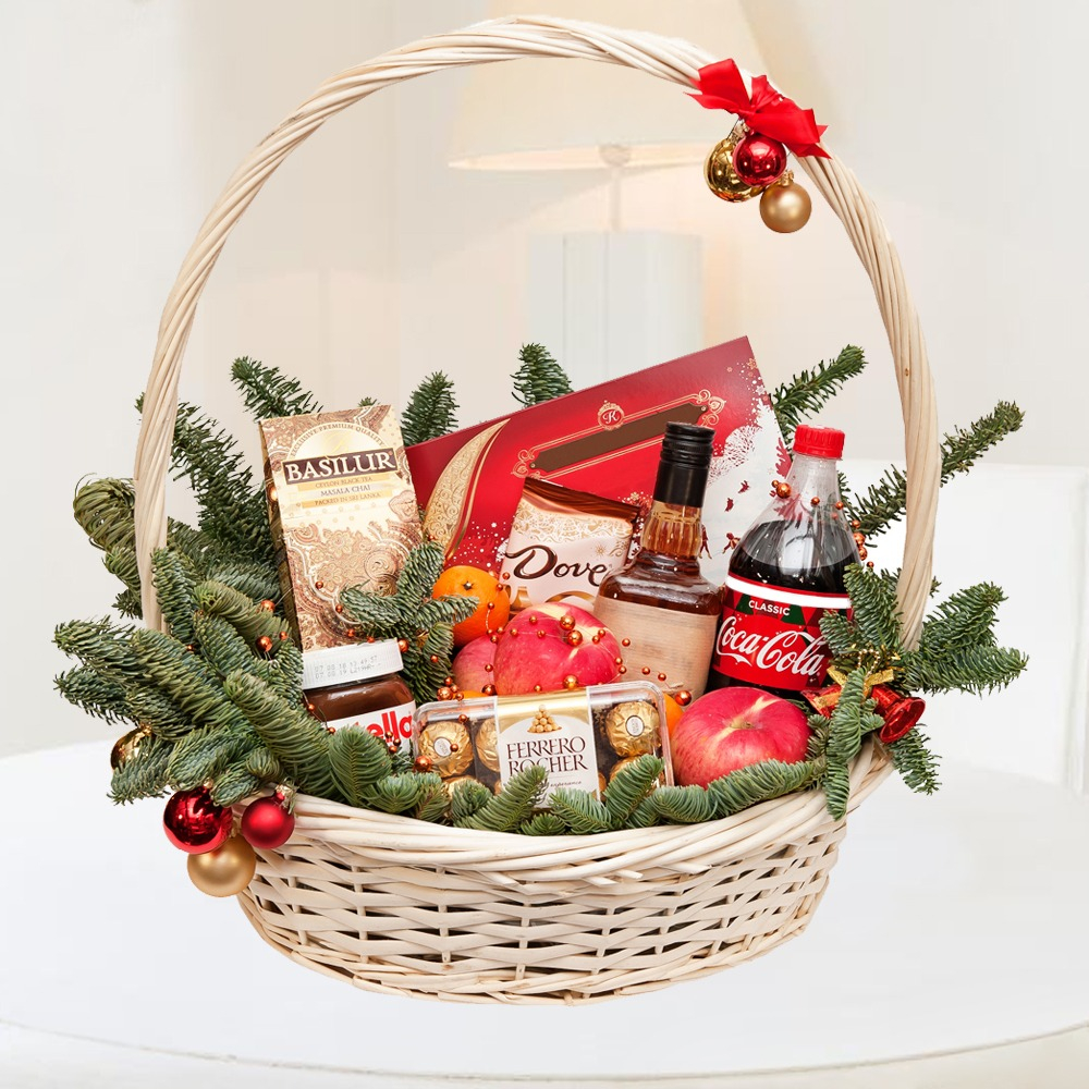 Der Blumenarrangement mit Edeltanne ist eine perfekte Auswahl an Geschenken für die Weihnachtszeit. Er wird in einer Verpackungsfolie von 1 Meter Länge präsentiert, die mit einem hübschen Verpackungsband umwickelt ist. Dieser Blumenarrangement ist in einem großen Korb platziert, der reichlich Platz für die vielfältigen Artikel bietet. Als süße Überraschung beinhaltet der Blumenarrangement eine Schachtel von Korkunow Pralinen mit 192 Gramm sowie eine Flasche Nutella Schokoladenaufstrich mit 350 Gramm, die den Gaumen verwöhnen werden. Die weihnachtliche Atmosphäre wird durch die beigefügte Weihnachtsdekoration verstärkt, zu der auch eine Weihnachtskugel gehört. Um den Blumenarrangement noch abwechslungsreicher zu gestalten, sind auch frische Äpfel, eine Flasche Whisky mit 0,5 Liter Inhalt, Tee im Sortiment mit 100 Gramm, saftige Mandarinen sowie eine Flasche Coca-Cola enthalten. Diese verschiedenen Leckereien sorgen für ein rundum gelungenes Geschmackserlebnis. Last but not least genieße auch die köstlichen Pralinen von Ferrero Rocher sowie eine Auswahl an Schokolade verschiedener Sorten. Der Blumenarrangement mit Edeltanne bietet somit eine perfekte Kombination aus Süßigkeiten und Getränken, um die Weihnachtszeit zu verschönern.