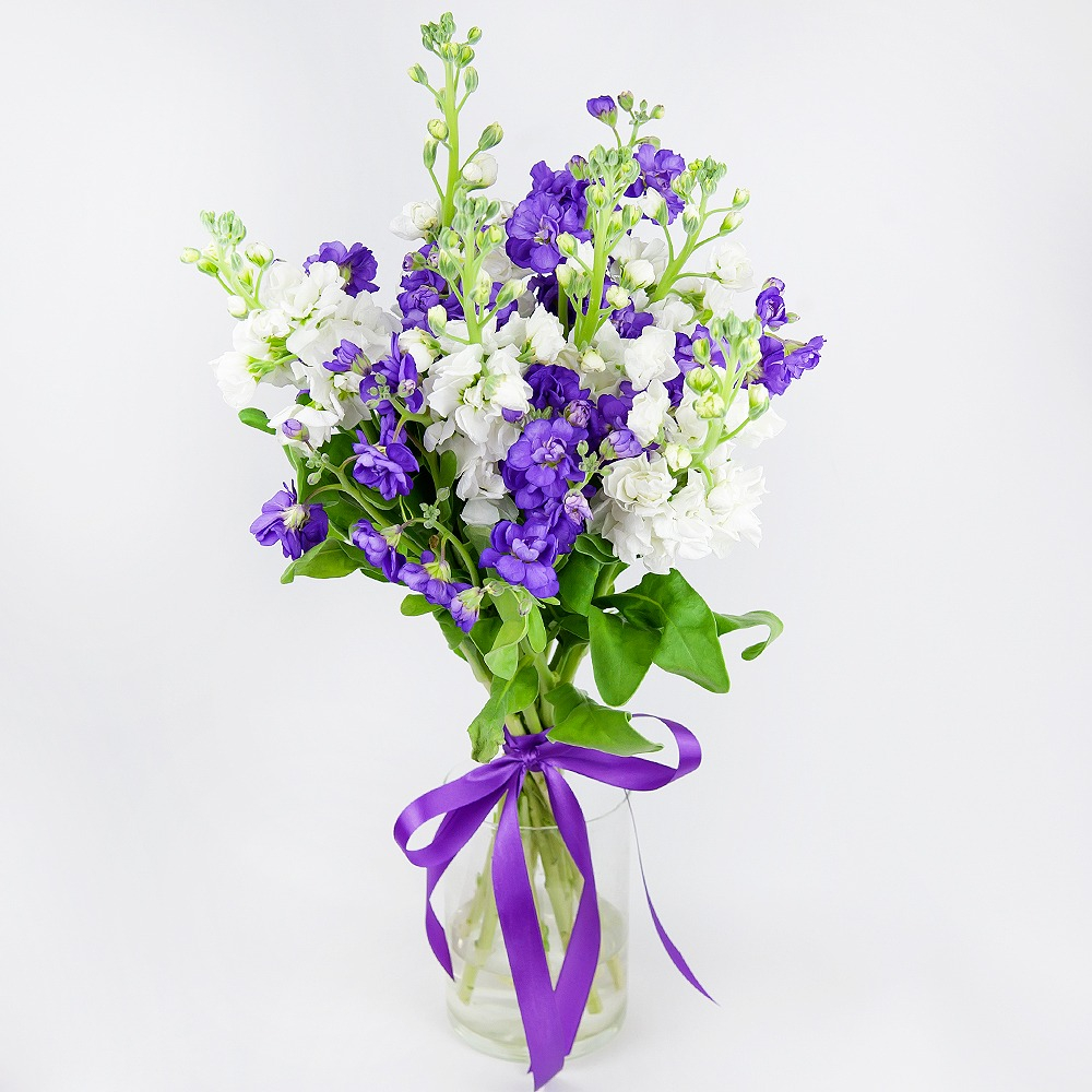 So ein einfacher und doch exquisiter Brautstrauß aus weißer und lila Levkoje für die zartesten Hochzeiten.