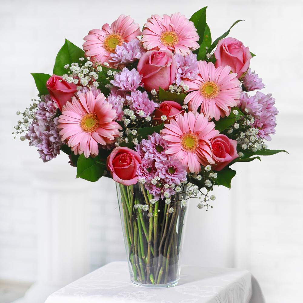 Der Strauß besteht aus Chrysanthemen, Gerbera, einer 50-60cm langen Rose, Schleierkraut und Salal. Die Blumen sind sorgfältig arrangiert und mit Verpackungsband zusammengebunden. Die Chrysanthemen ...