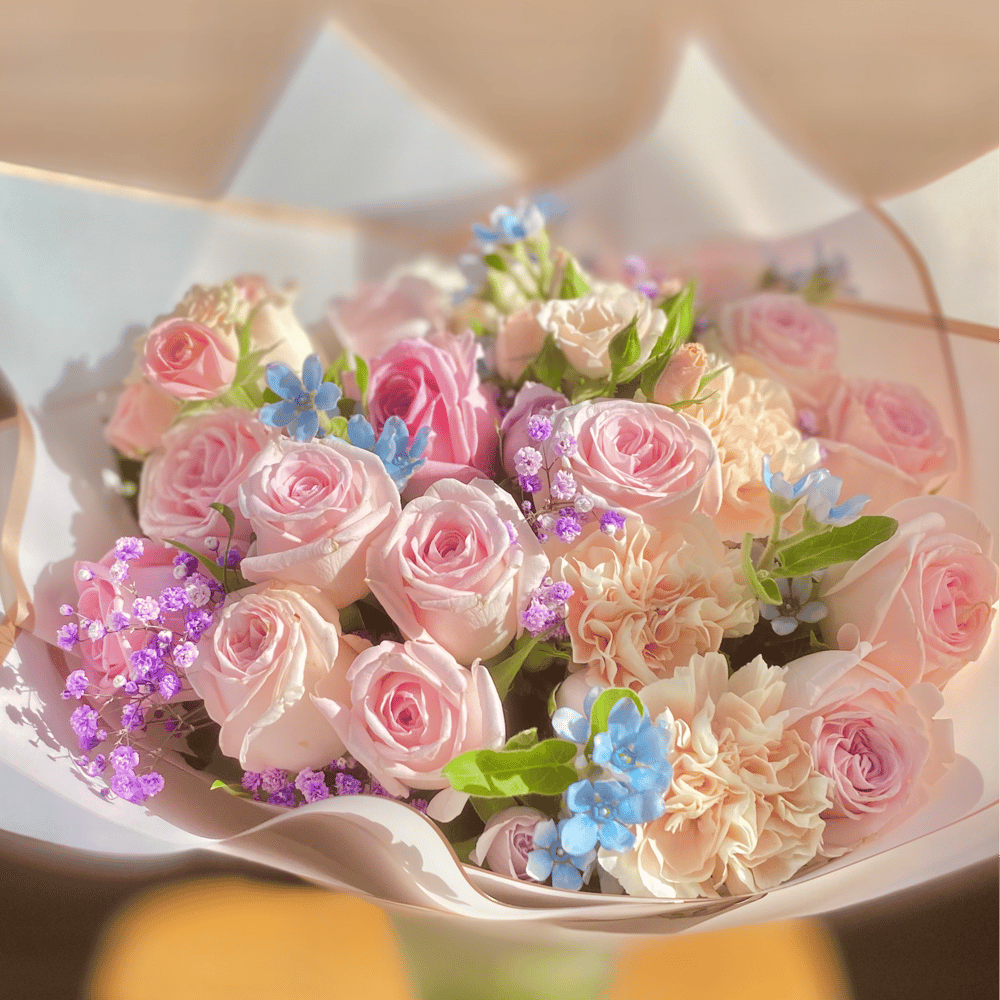 Dieser Strauß verkörpert Zartheit und Luftigkeit mit jeder Blume. Die Kombination aus zartrosa Rosen und Tweedia ist fesselnd. Der Provence-Strauß ist inspiriert von der Leichtigkeit und Raffinesse des französischen Stils