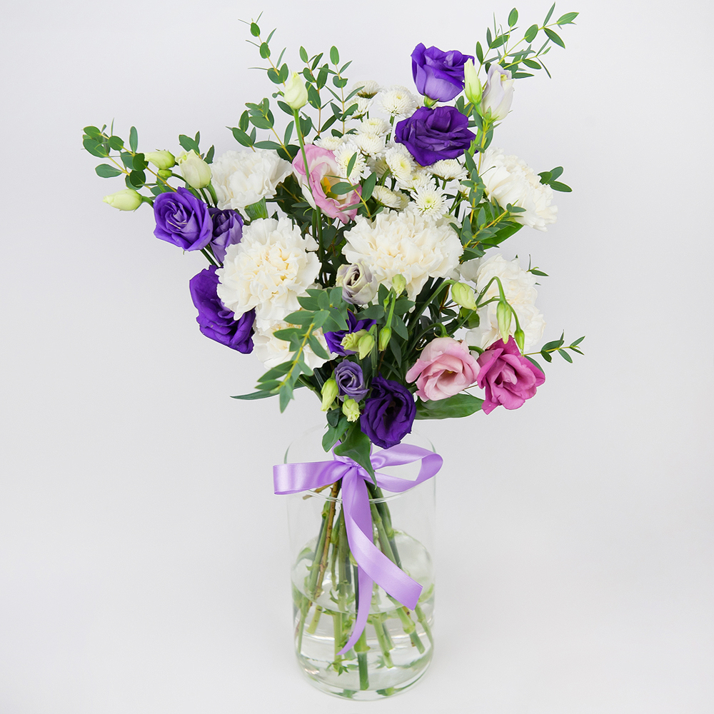 Schauen Sie sich diesen erstaunlichen Strauß aus weißen Nelken, rosa und lila Lisianthus und kleinen Spraynelken an! Wir versprechen, dass es ein wunderbares Geschenk für jeden Anlass für Ihren besonderen Menschen sein wird.