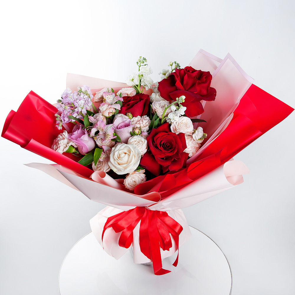 Der Strauß "Scharlachrote Romantik" ist die Verkörperung von Leidenschaft und Zärtlichkeit, kreiert aus den erlesensten Blumen. Der Strauß besteht aus roten ecuadorianischen Rosen, Levkojen, Nelke...