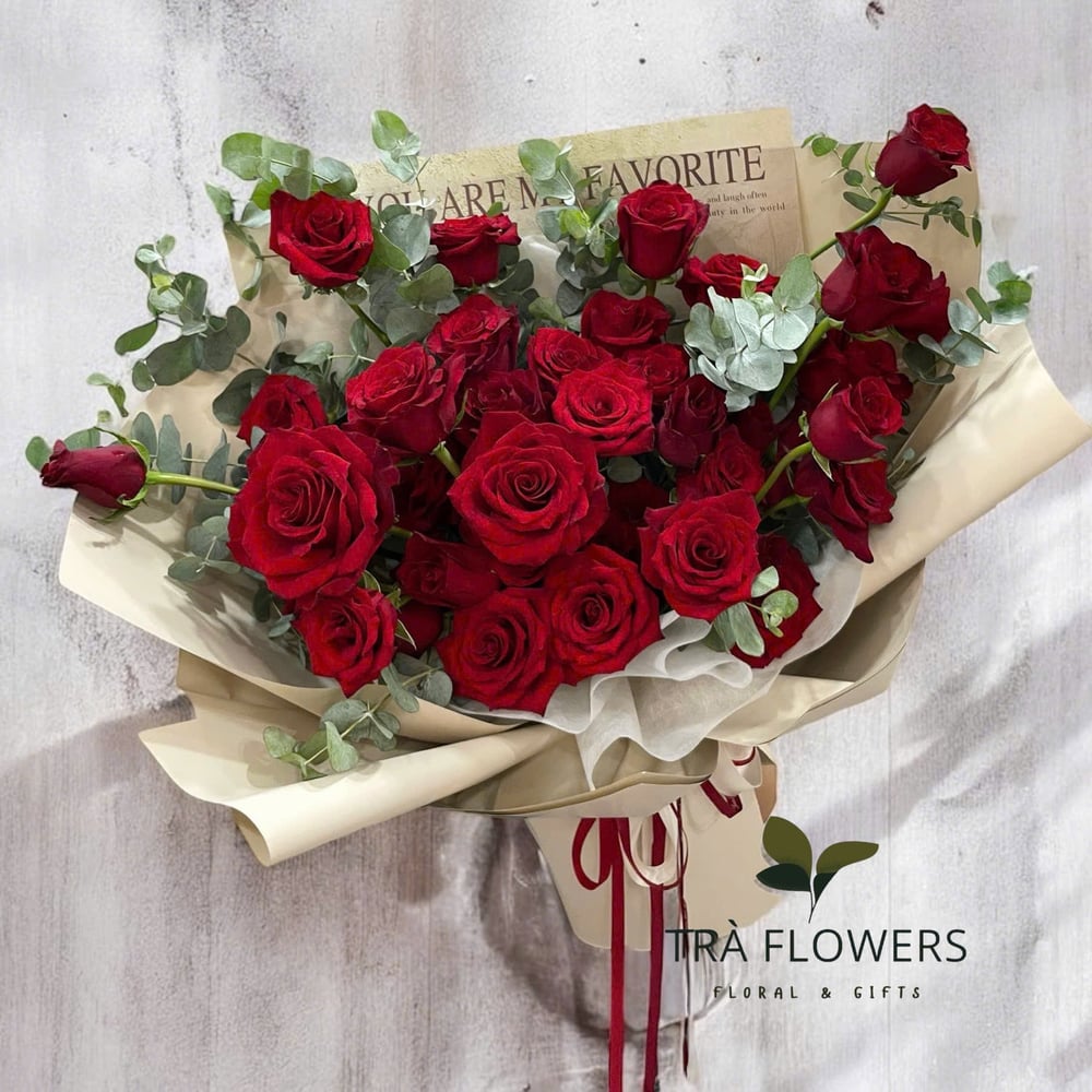 Drücke deine Liebe und Hingabe mit dieser romantischen Geste aus — ein atemberaubender Strauß aus 20 perfekt roten Rosen, kunstvoll mit üppigem Grün arrangiert. Blumenanzahl (ungefähr): 20 rote Rosen, Eukalyptus (zahlreiche Stiele).