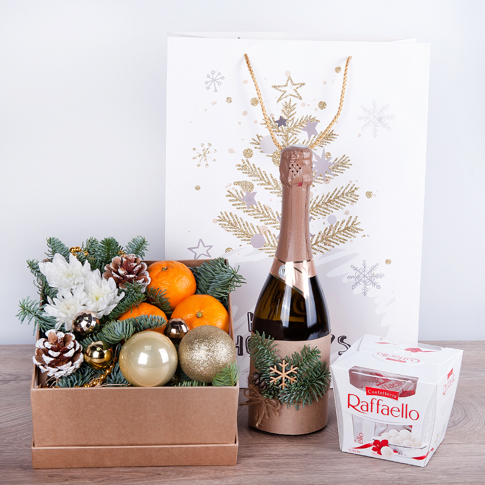Dieser wunderschöne Blumenstrauß ist perfekt für die Weihnachtszeit. Er besteht aus zarten Chrysanthemen und duftender Edeltanne, die dem Strauß eine festliche Note verleihen. Die Blumen sind kunstvoll in einer speziellen Blumenarrangement-Box angeordnet, die mit einer eleganten Weihnachtsdekoration verziert ist. Um das weihnachtliche Gefühl noch zu verstärken, sind auch Zapfen in den Strauß eingebunden. Sie bringen einen rustikalen Charme in das Arrangement. Zusätzlich enthält der Strauß eine Flasche alkoholfreien Champagner oder Wein, um auf die Feiertage anzustoßen. Für die süße Note ist eine Mandarine dabei, die dem Strauß eine frische und fruchtige Note verleiht. Ein schönes Extra ist eine Geschenktüte, die dem Strauß beiliegt. Darin befinden sich köstliche Pralinen vom berühmten Raffaello, die zum Naschen und Genießen einladen. Dieser Blumenstrauß ist das perfekte Geschenk für Familie, Freunde oder Kollegen in der Weihnachtszeit. Mit seinen festlichen Elementen und den köstlichen Beigaben bringt er Freude und festliche Stimmung in jedes Zuhause.