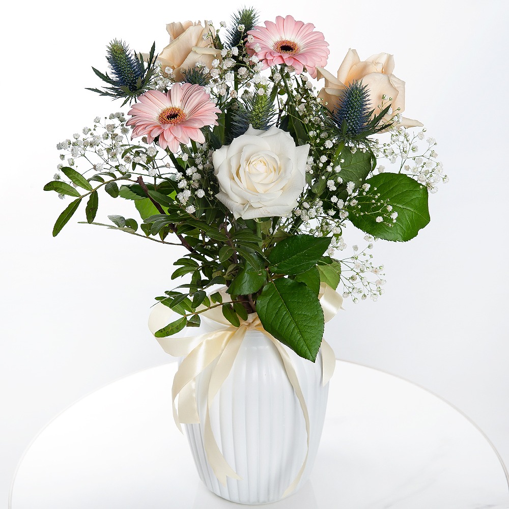 Dieser wunderschöne Blumenstrauß besteht aus einer Kombination von Gerbera, Schleierkraut, einer 50-60cm langen Rose, Pistazienblatt und Eringium. Die Gerbera ist eine leuchtende Blume mit kräftige...