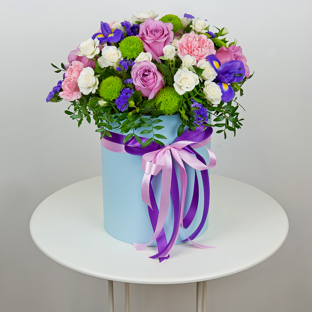Dieser wunderschöne Blumenstrauß besteht aus Chrysanthemen, lila Rosen in tiefem Lila, Schwertlilien, Strauchrosen, Pistazienblättern und Strandflieder, auch bekannt als Statice. Der Strauß wird in einem runden Blumenkasten mit den Maßen 25x22 cm präsentiert und ist mit Verpackungsfolie von 1 Meter Länge sorgfältig verpackt. Das Verpackungsband sichert den Strauß und gibt ihm eine elegante Note. Um die Blumen sicher zu halten, ist Steckschaum verwendet worden. Diese Vielfalt an frischen Blumen verleiht dem Strauß eine natürliche und lebendige Ausstrahlung. Egal ob als Geschenk oder zur Dekoration, dieser Blumenstrauß wird sicherlich Freude bereiten.