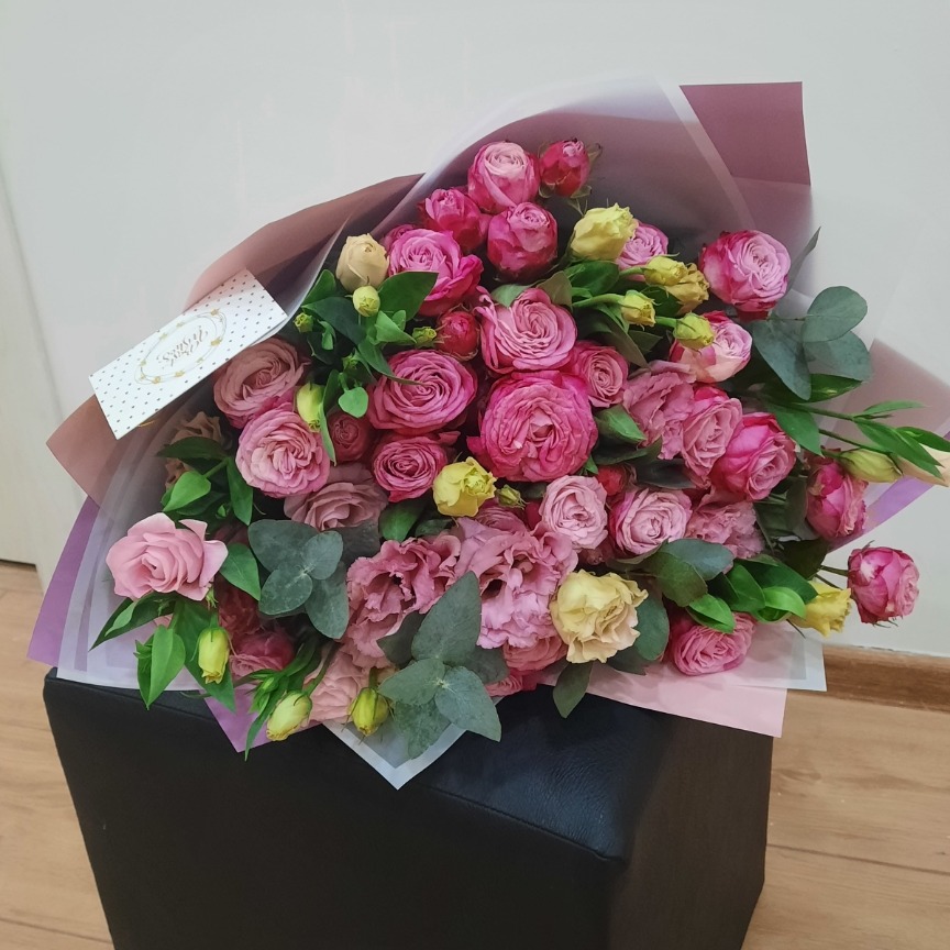 Bouquet aus pfingstrosenartigen Strauchrosen, Lisianthus und Eukalyptus in Designerverpackung