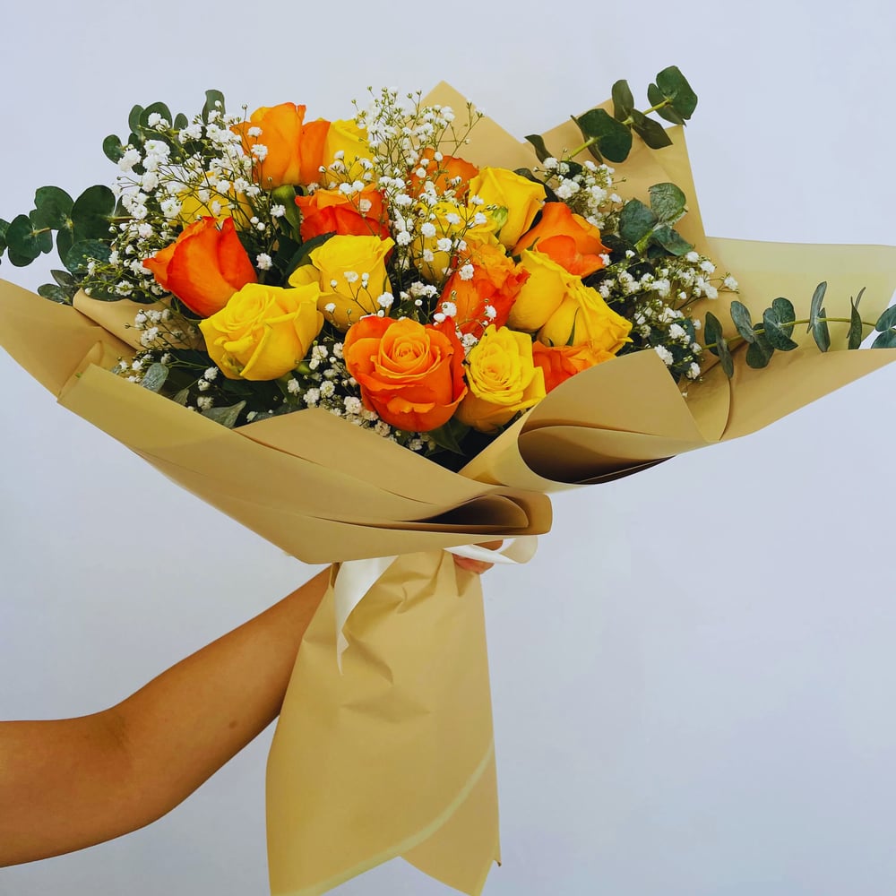 Wunderschön eingepackter Blumenstrauß aus gelben Rosen (9 Stiele), orangefarbenen Rosen (8 Stiele), weißer Gypsophila (7 Stiele) und Eukalyptus (5 Stiele).