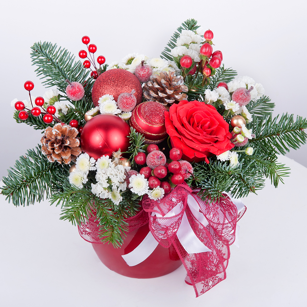Der Chrysanthemum Stallion ist das Zentrum dieses atemberaubenden Blumenarrangements. Mit seiner tiefroten Farbe und einer beeindruckenden Länge von 50cm strahlt die rote Rose Eleganz aus. Das Johanniskraut fügt dem Strauß einen Hauch von Natürlichkeit hinzu, während das Statice (Strandflieder) mit seiner zarten lila Farbe dem Blumenarrangement einen Hauch von Romantik verleiht. Die Edeltanne ergänzt das Blumenarrangement perfekt und sorgt für eine festliche Note. Der Keramiktopf gibt dem Blumenarrangement einen stilvollen Look und sorgt gleichzeitig für einen sicheren Halt der Blumen. Der Steckschaum im Topf gewährleistet, dass die Blumen frisch und hydratisiert bleiben. Das Verpackungsband umhüllt den Strauß und verleiht ihm einen raffinierten Touch. Eine Spitze verleiht dem Blumenarrangement einen Hauch von Eleganz und unterstreicht die Schönheit der Blumen. Ein dekoratives Element medium fügt dem Blumenarrangement einen zusätzlichen Akzent hinzu. Die Zapfen und die Weihnachtsdekoration verleihen dem Blumenarrangement einen festlichen Touch und machen es zu einer perfekten Dekoration für die Weihnachtszeit. Dieses Blumenarrangement ist ein wahrer Blickfang und eignet sich perfekt als Geschenk oder als Dekoration für jeden Anlass. Lass Dich von seiner Schönheit verzaubern!