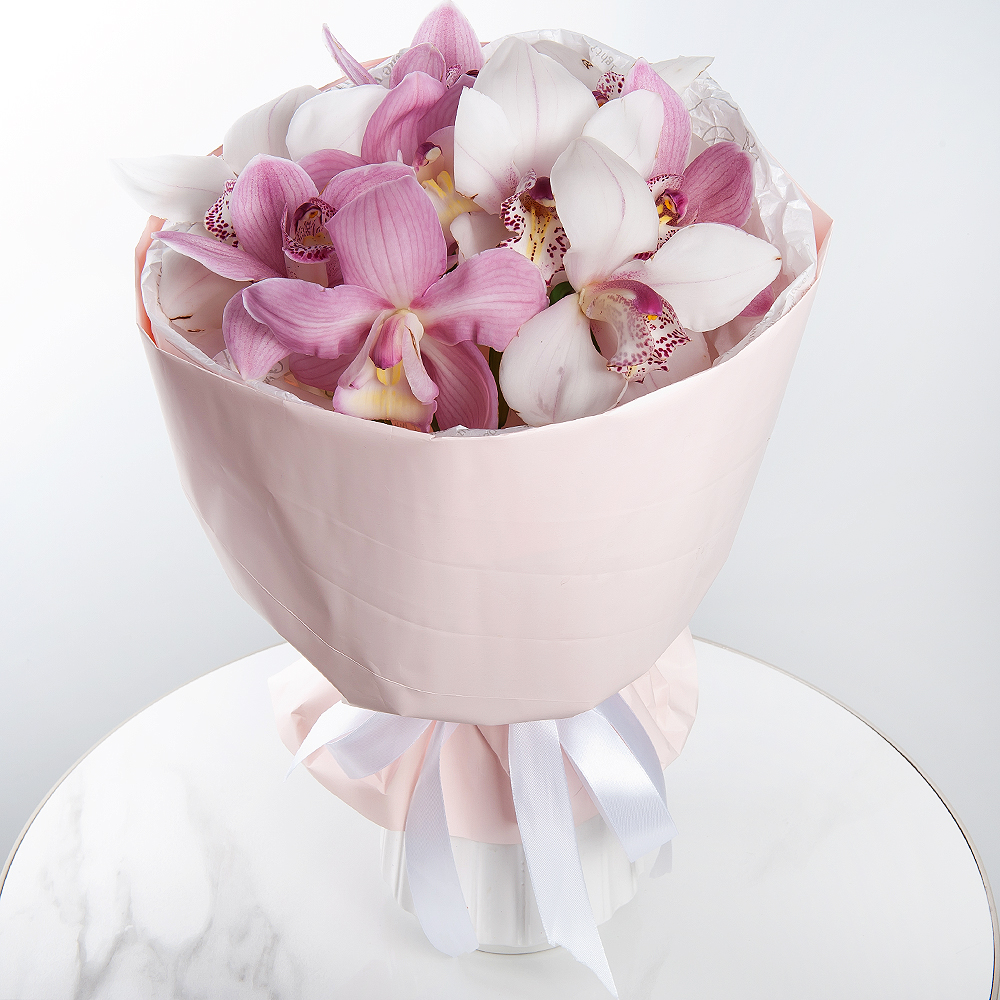 Der Strauß "Weiß-Rosa Elegie" ist die Verkörperung von Zärtlichkeit und Eleganz, geschaffen aus den erlesensten Blumen. Der Strauß besteht aus 9 Cymbidium-Orchideen. Diese Blumen symbolisieren Lux...