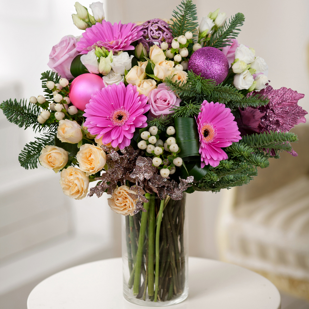 Dieser wunderschöne Blumenstrauß ist eine perfekte Mischung aus Eleganz und Schönheit. Er besteht aus zarten Lisianthus-Blumen, die in einem zarten Lila erstrahlen. Die Lisianthus-Blumen werden von einigen tiefpurpurnen Rosen umrahmt, die dem Strauß eine zusätzliche Dimension verleihen. Die gerbera-Blumen verleihen dem Blumenstrauß eine lebhafte Note mit ihren leuchtenden Farben. Die Edeltannenzweige fügen einen Hauch von Frische hinzu und sorgen für eine festliche Atmosphäre. Das Johanniskraut bringt etwas Natürlichkeit in den Strauß und verleiht ihm einen rustikalen Charme. Die Aspidistra-Blätter sorgen für einen eleganten Hintergrund und betonen die Schönheit der Blumen. Der Strauß wird mit einem dekorativen Element und einem Verpackungsband geschmückt, um ihm den letzten Schliff zu geben. Die Weihnachtsdekoration verleiht dem Strauß eine festliche Note und macht ihn zu einer idealen Wahl für die Feiertage. Ob als Geschenk für einen geliebten Menschen oder als Dekoration für Dein Zuhause, dieser Blumenstrauß ist sicherlich ein Blickfang. Mit seiner Mischung aus eleganten Blumen und saisonalen Elementen ist er ein perfektes Accessoire für die Winterzeit.
