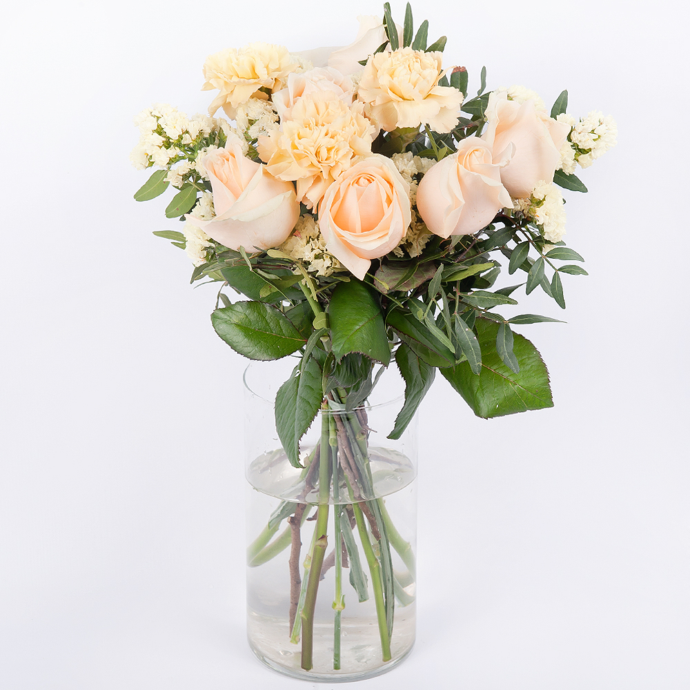 Dieser wunderschöne Blumenstrauß besteht aus cremefarbenen Rosen, die eine Höhe von 50cm erreichen. Die zarten Nelken verleihen dem Blumenarrangement eine romantische Note. Um die Rosen herum werde...
