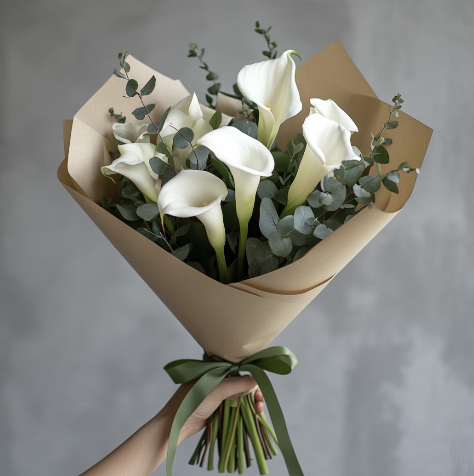 Der Strauß 'Zarte Reinheit' vereint die elegante Schönheit von 7 weißen Calla-Lilien mit der frischen Note von Eukalyptus. Die schlichten, aber anmutigen Calla-Lilien symbolisieren Reinheit und Elega…